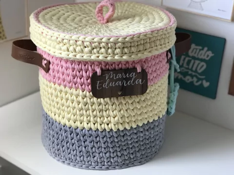 Lindo cesto feito em fio de malha, ideal para organizar brinquedos no quarto das crianças, roupas, ou organizar qualquer outro canto da sua casa ou escritório. Tem alça de couro ecológica e também plaquinha personalizável!!