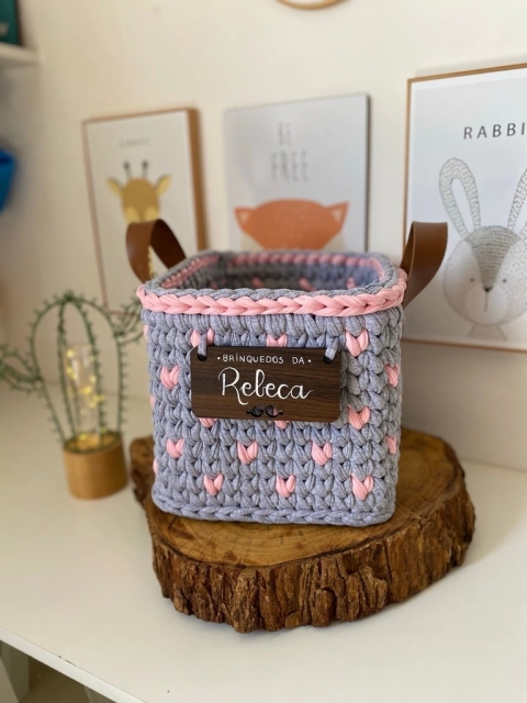 Cesto Coraçãozinho 25x25x20 alça Couro Ecológica e Plaquinha