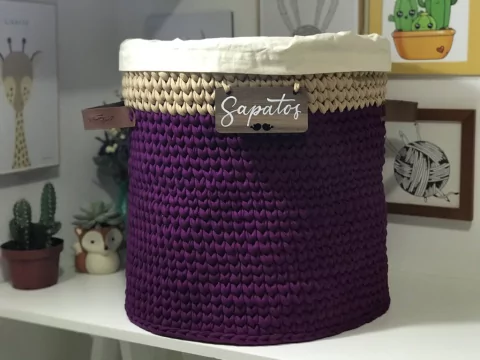 - > Cesto Fio de Malha 40x40 c alça de Couro Ecológica, plaquinha e forro